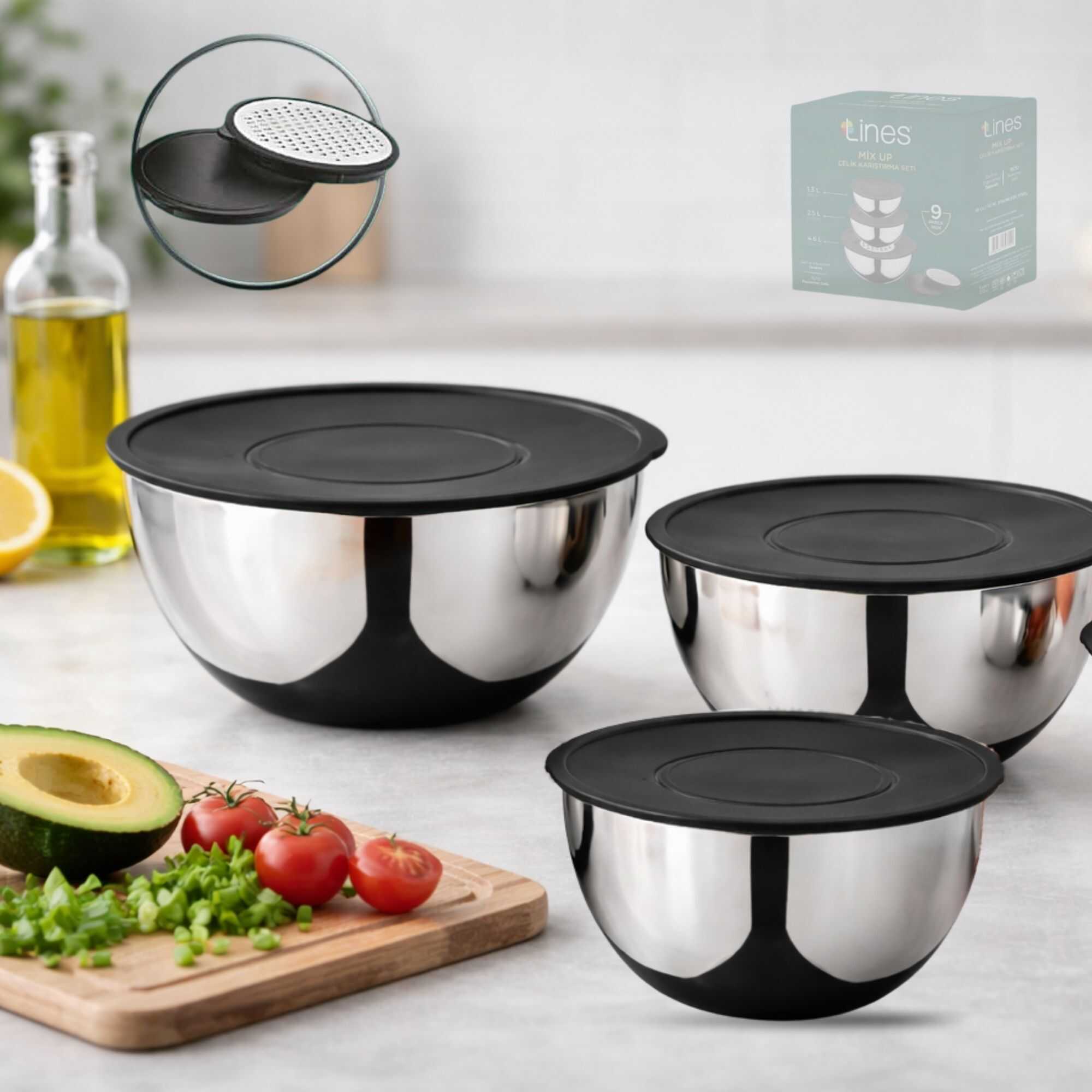 Lines Mix up Paslanmaz Çelik Rendeli Karıştırma Seti 9 parça Inox